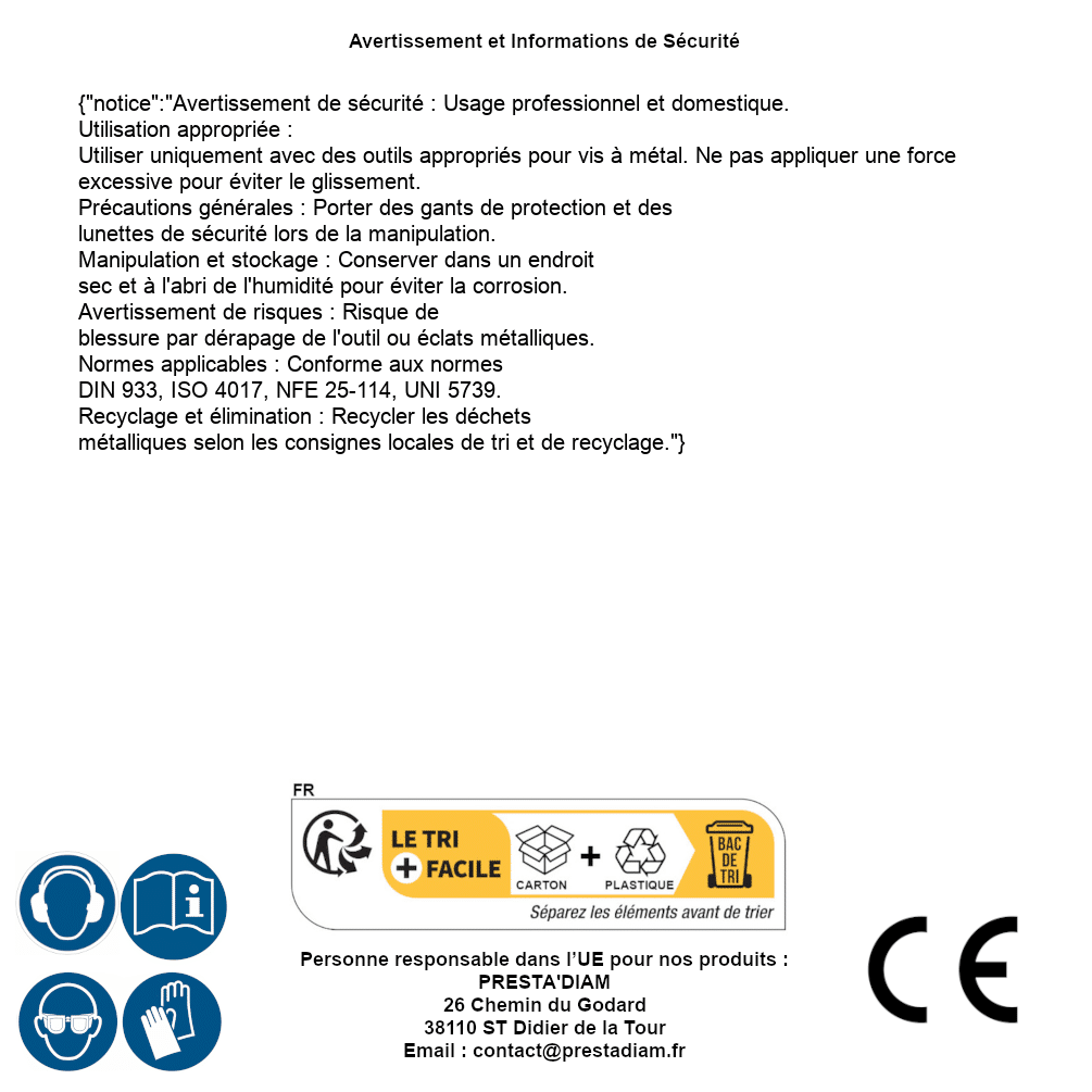 | WARNING and SAFETY | Identification de la personne responsable dans l’UE : Nom : PRESTA'DIAM. Adresse : 26 Chemin du Godard, 38110 ST Didier de la Tour (France). Email : contact@prestadiam.fr. |