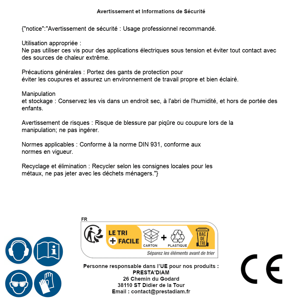 | WARNING and SAFETY | Identification de la personne responsable dans l’UE : Nom : PRESTA'DIAM. Adresse : 26 Chemin du Godard, 38110 ST Didier de la Tour (France). Email : contact@prestadiam.fr. |