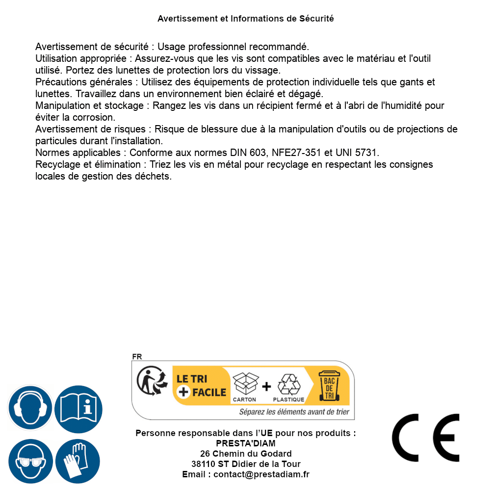 | WARNING and SAFETY | Identification de la personne responsable dans l’UE : Nom : PRESTA'DIAM. Adresse : 26 Chemin du Godard, 38110 ST Didier de la Tour (France). Email : contact@prestadiam.fr. |