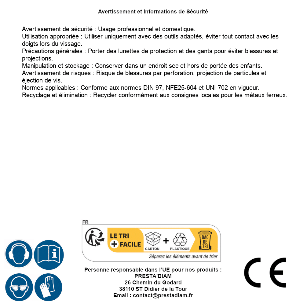 | WARNING and SAFETY | Identification de la personne responsable dans l’UE : Nom : PRESTA'DIAM. Adresse : 26 Chemin du Godard, 38110 ST Didier de la Tour (France). Email : contact@prestadiam.fr. |