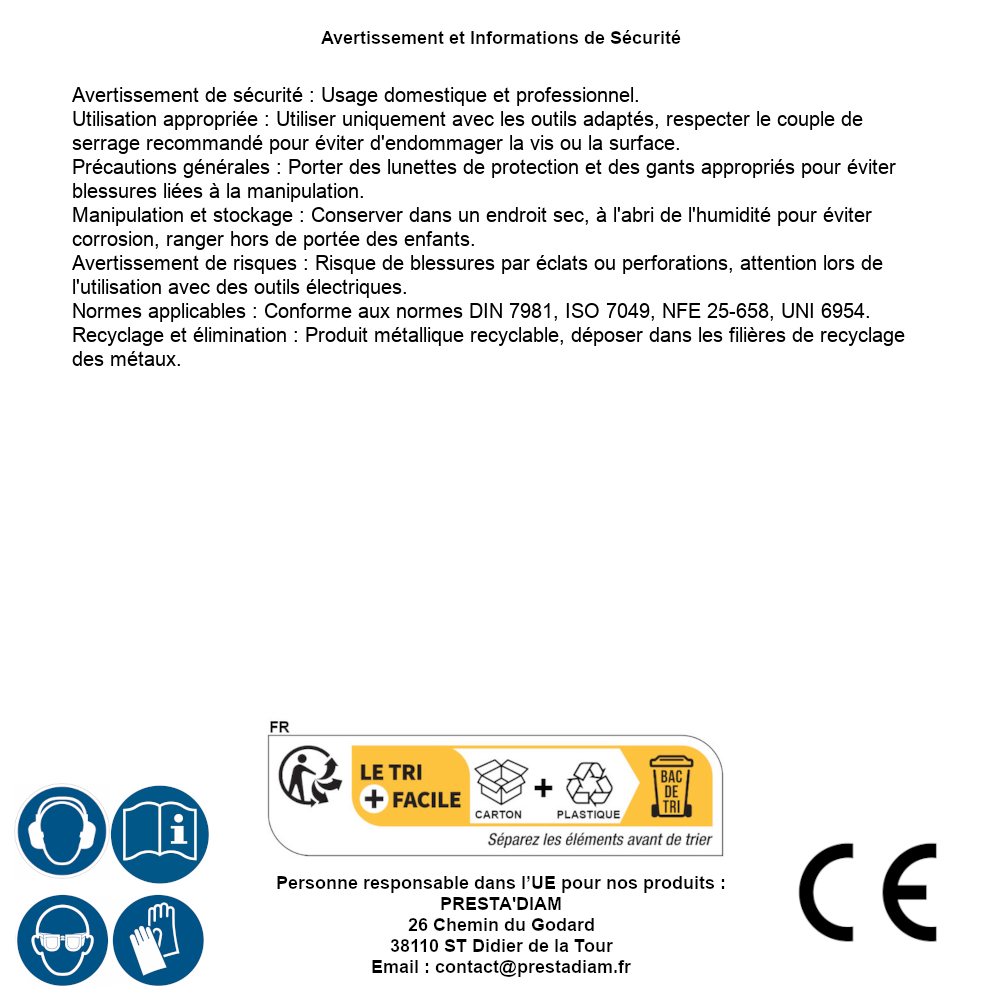 | WARNING and SAFETY | Identification de la personne responsable dans l’UE : Nom : PRESTA'DIAM. Adresse : 26 Chemin du Godard, 38110 ST Didier de la Tour (France). Email : contact@prestadiam.fr. |
