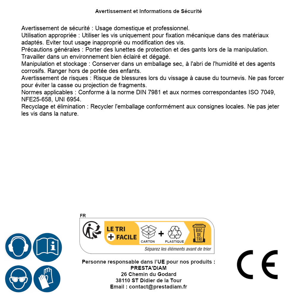 | WARNING and SAFETY | Identification de la personne responsable dans l’UE : Nom : PRESTA'DIAM. Adresse : 26 Chemin du Godard, 38110 ST Didier de la Tour (France). Email : contact@prestadiam.fr. |