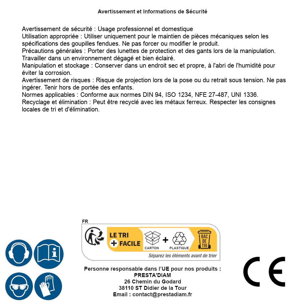 | WARNING and SAFETY | Identification de la personne responsable dans l’UE : Nom : PRESTA'DIAM. Adresse : 26 Chemin du Godard, 38110 ST Didier de la Tour (France). Email : contact@prestadiam.fr. |