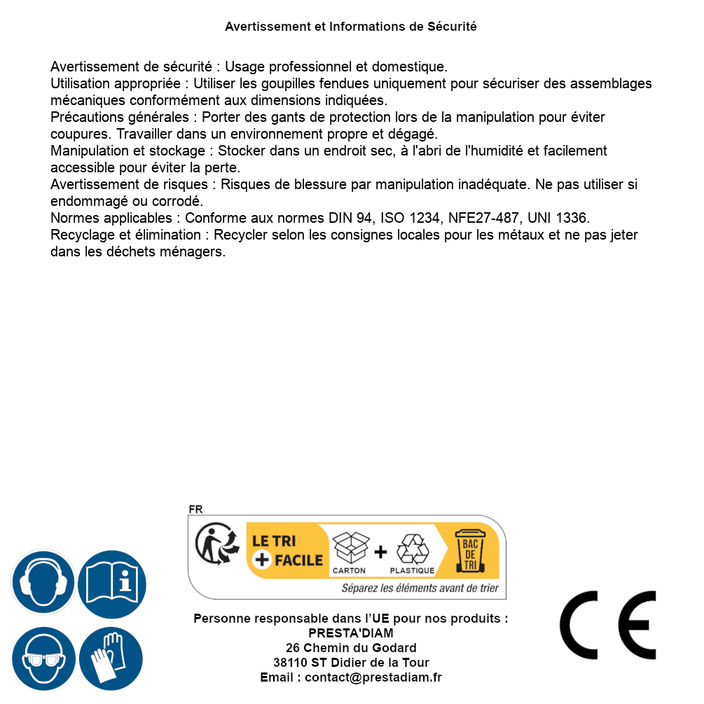 | WARNING and SAFETY | Identification de la personne responsable dans l’UE : Nom : PRESTA'DIAM. Adresse : 26 Chemin du Godard, 38110 ST Didier de la Tour (France). Email : contact@prestadiam.fr. |