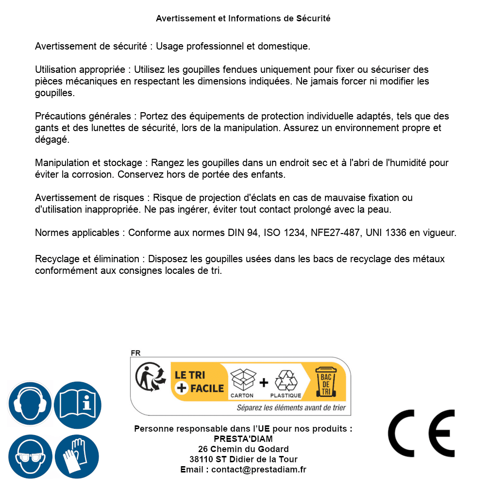 | WARNING and SAFETY | Identification de la personne responsable dans l’UE : Nom : PRESTA'DIAM. Adresse : 26 Chemin du Godard, 38110 ST Didier de la Tour (France). Email : contact@prestadiam.fr. |