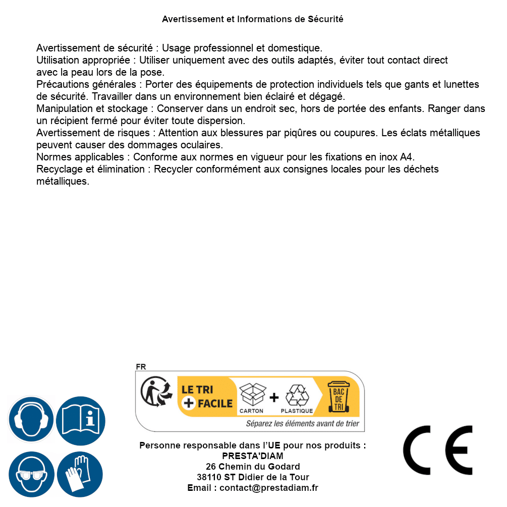 | WARNING and SAFETY | Identification de la personne responsable dans l’UE : Nom : PRESTA'DIAM. Adresse : 26 Chemin du Godard, 38110 ST Didier de la Tour (France). Email : contact@prestadiam.fr. |