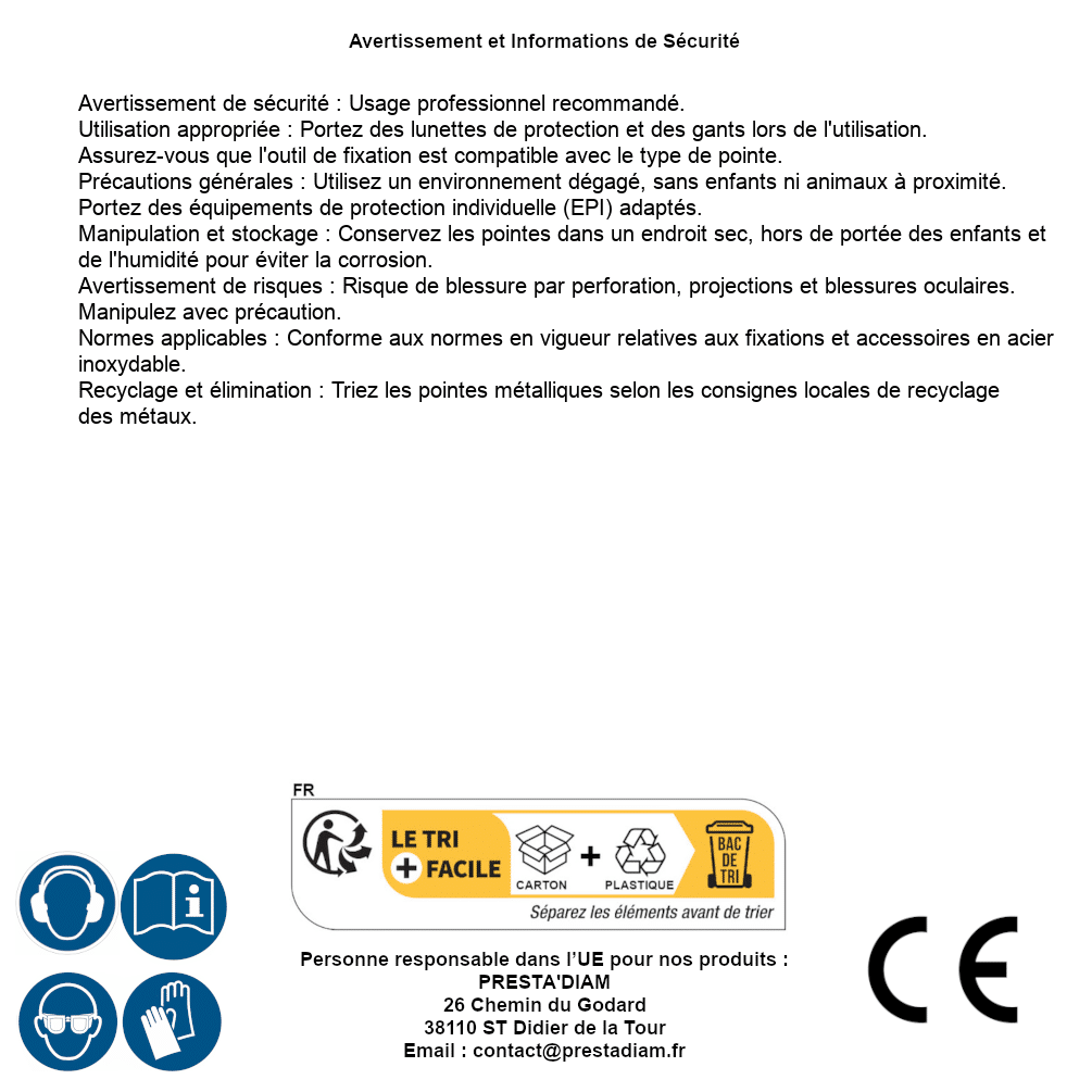 | WARNING and SAFETY | Identification de la personne responsable dans l’UE : Nom : PRESTA'DIAM. Adresse : 26 Chemin du Godard, 38110 ST Didier de la Tour (France). Email : contact@prestadiam.fr. |