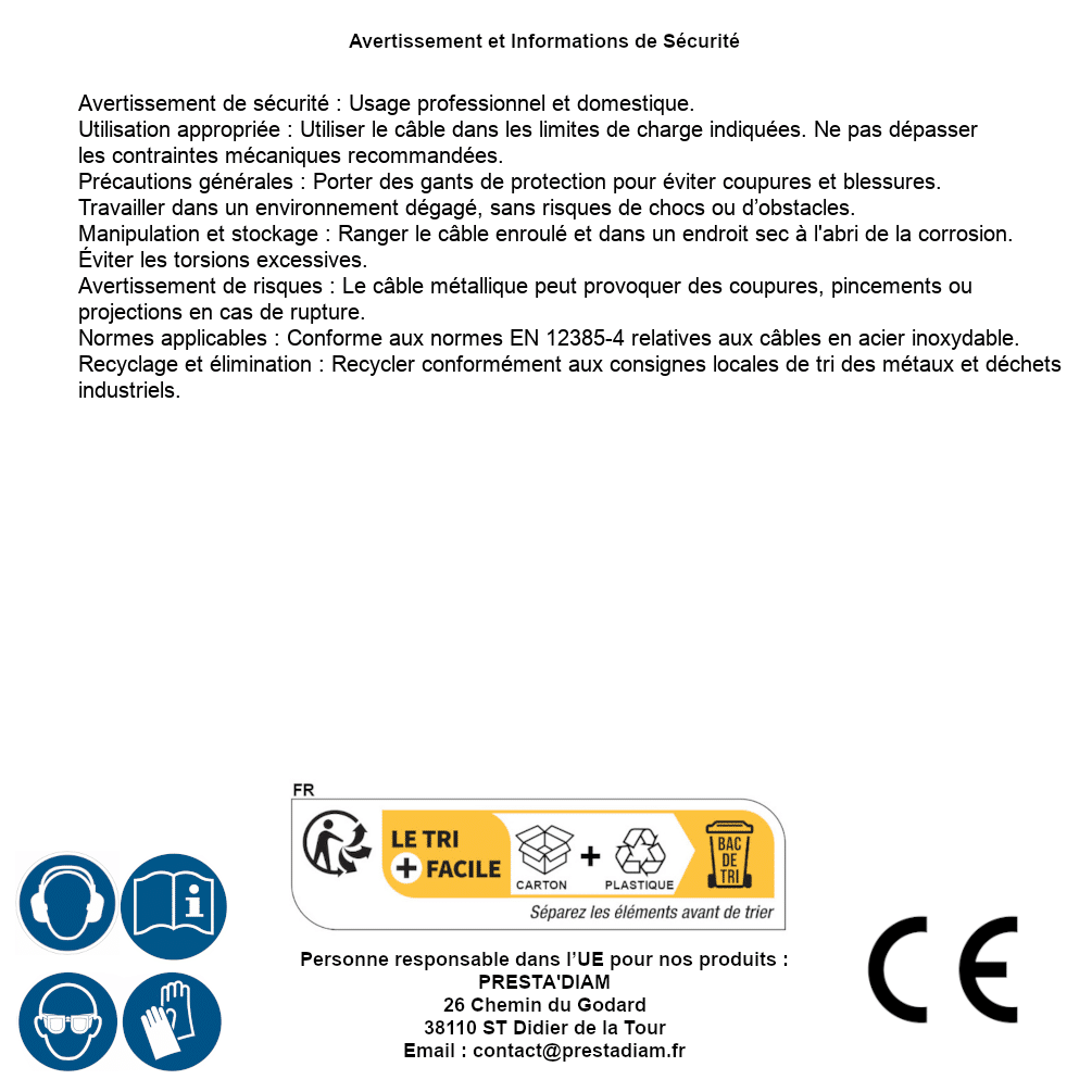 | WARNING and SAFETY | Identification de la personne responsable dans l’UE : Nom : PRESTA'DIAM. Adresse : 26 Chemin du Godard, 38110 ST Didier de la Tour (France). Email : contact@prestadiam.fr. |