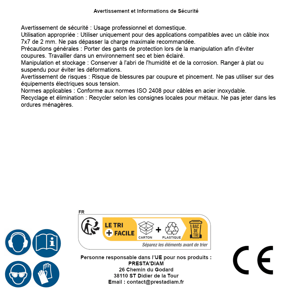 | WARNING and SAFETY | Identification de la personne responsable dans l’UE : Nom : PRESTA'DIAM. Adresse : 26 Chemin du Godard, 38110 ST Didier de la Tour (France). Email : contact@prestadiam.fr. |