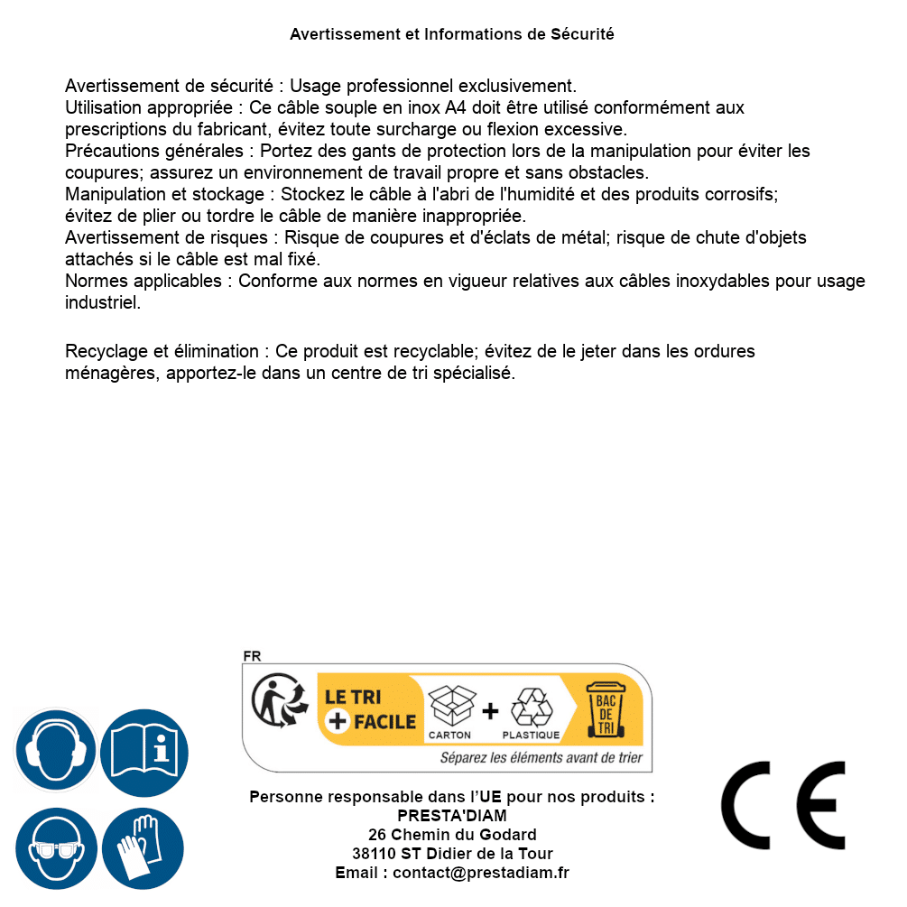 | WARNING and SAFETY | Identification de la personne responsable dans l’UE : Nom : PRESTA'DIAM. Adresse : 26 Chemin du Godard, 38110 ST Didier de la Tour (France). Email : contact@prestadiam.fr. |