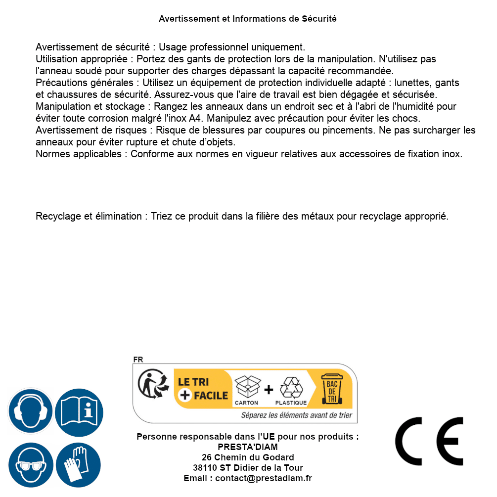| WARNING and SAFETY | Identification de la personne responsable dans l’UE : Nom : PRESTA'DIAM. Adresse : 26 Chemin du Godard, 38110 ST Didier de la Tour (France). Email : contact@prestadiam.fr. |