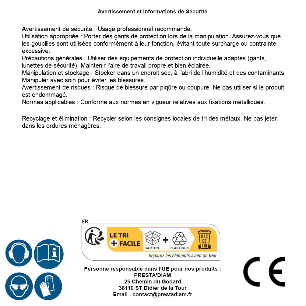 | WARNING and SAFETY | Identification de la personne responsable dans l’UE : Nom : PRESTA'DIAM. Adresse : 26 Chemin du Godard, 38110 ST Didier de la Tour (France). Email : contact@prestadiam.fr. |