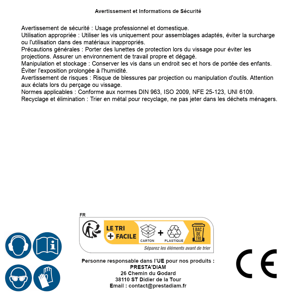 | WARNING and SAFETY | Identification de la personne responsable dans l’UE : Nom : PRESTA'DIAM. Adresse : 26 Chemin du Godard, 38110 ST Didier de la Tour (France). Email : contact@prestadiam.fr. |