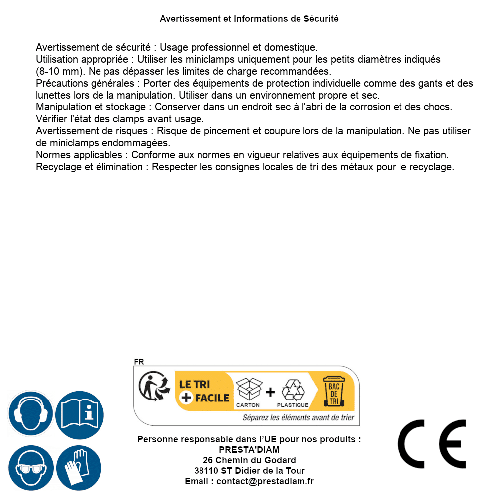 | WARNING and SAFETY | Identification de la personne responsable dans l’UE : Nom : PRESTA'DIAM. Adresse : 26 Chemin du Godard, 38110 ST Didier de la Tour (France). Email : contact@prestadiam.fr. |
