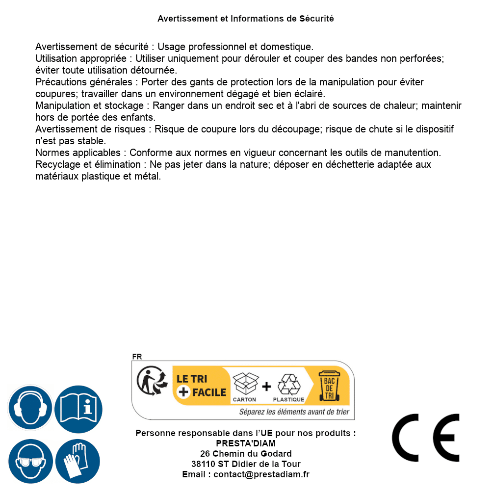 | WARNING and SAFETY | Identification de la personne responsable dans l’UE : Nom : PRESTA'DIAM. Adresse : 26 Chemin du Godard, 38110 ST Didier de la Tour (France). Email : contact@prestadiam.fr. |