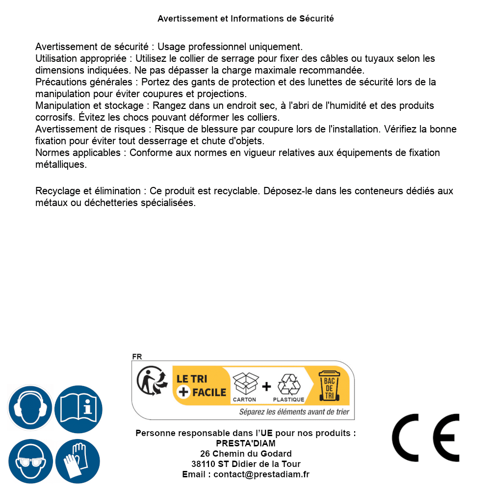 | WARNING and SAFETY | Identification de la personne responsable dans l’UE : Nom : PRESTA'DIAM. Adresse : 26 Chemin du Godard, 38110 ST Didier de la Tour (France). Email : contact@prestadiam.fr. |