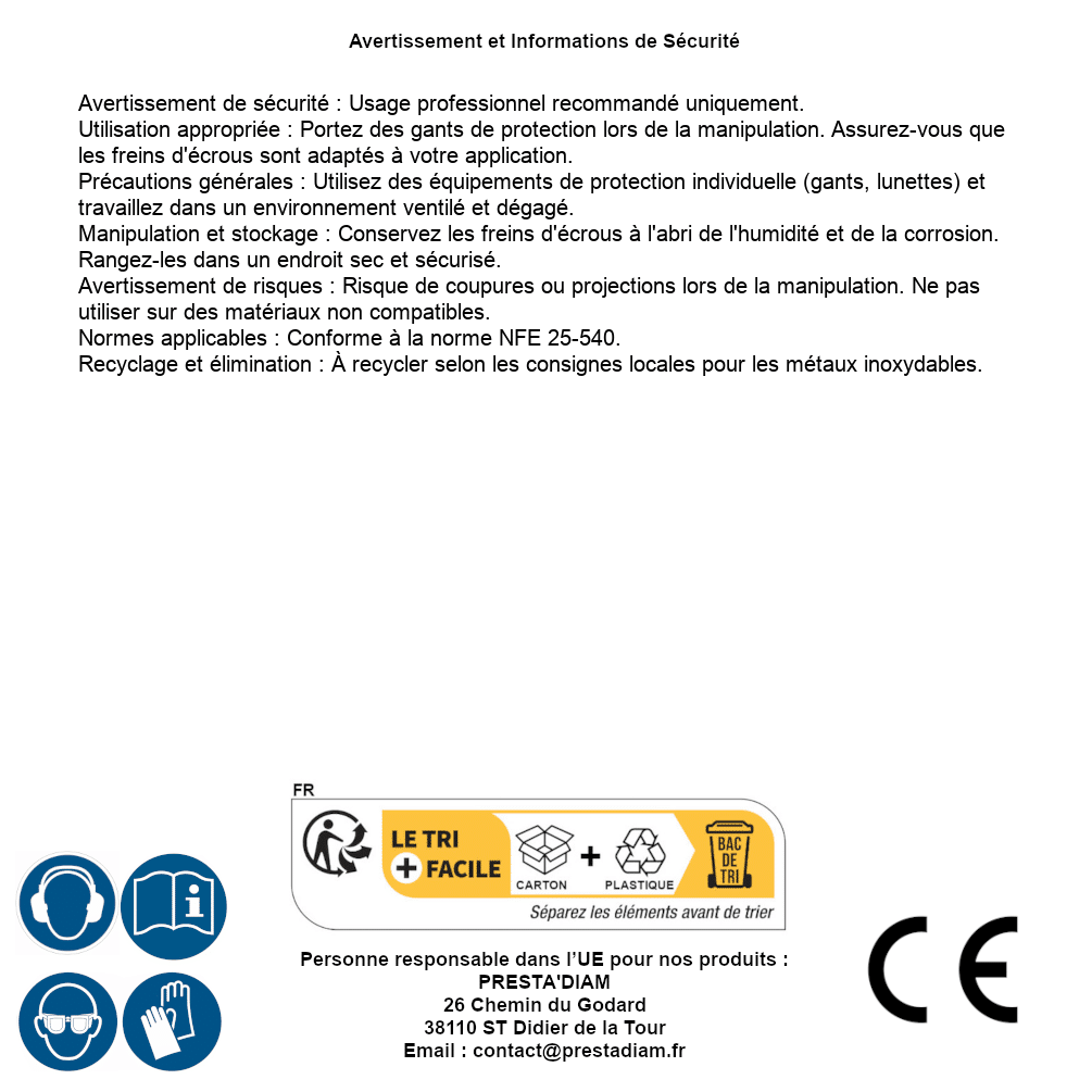 | WARNING and SAFETY | Identification de la personne responsable dans l’UE : Nom : PRESTA'DIAM. Adresse : 26 Chemin du Godard, 38110 ST Didier de la Tour (France). Email : contact@prestadiam.fr. |