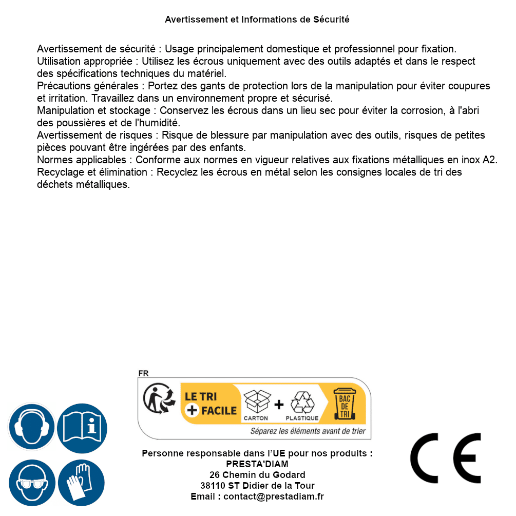 | WARNING and SAFETY | Identification de la personne responsable dans l’UE : Nom : PRESTA'DIAM. Adresse : 26 Chemin du Godard, 38110 ST Didier de la Tour (France). Email : contact@prestadiam.fr. |