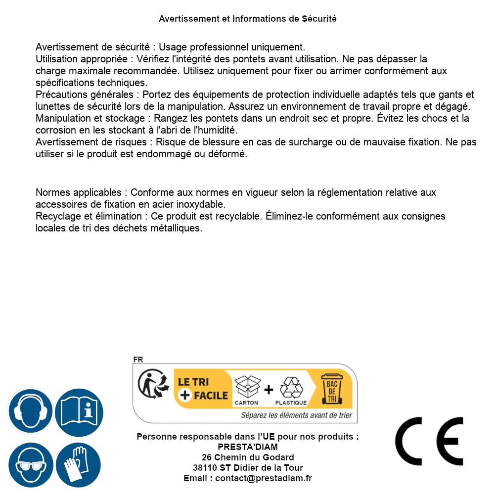 | WARNING and SAFETY | Identification de la personne responsable dans l’UE : Nom : PRESTA'DIAM. Adresse : 26 Chemin du Godard, 38110 ST Didier de la Tour (France). Email : contact@prestadiam.fr. |