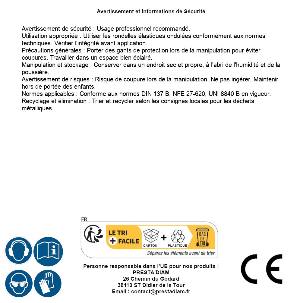| WARNING and SAFETY | Identification de la personne responsable dans l’UE : Nom : PRESTA'DIAM. Adresse : 26 Chemin du Godard, 38110 ST Didier de la Tour (France). Email : contact@prestadiam.fr. |