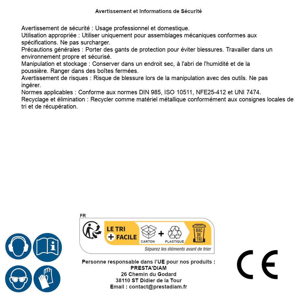| WARNING and SAFETY | Identification de la personne responsable dans l’UE : Nom : PRESTA'DIAM. Adresse : 26 Chemin du Godard, 38110 ST Didier de la Tour (France). Email : contact@prestadiam.fr. |