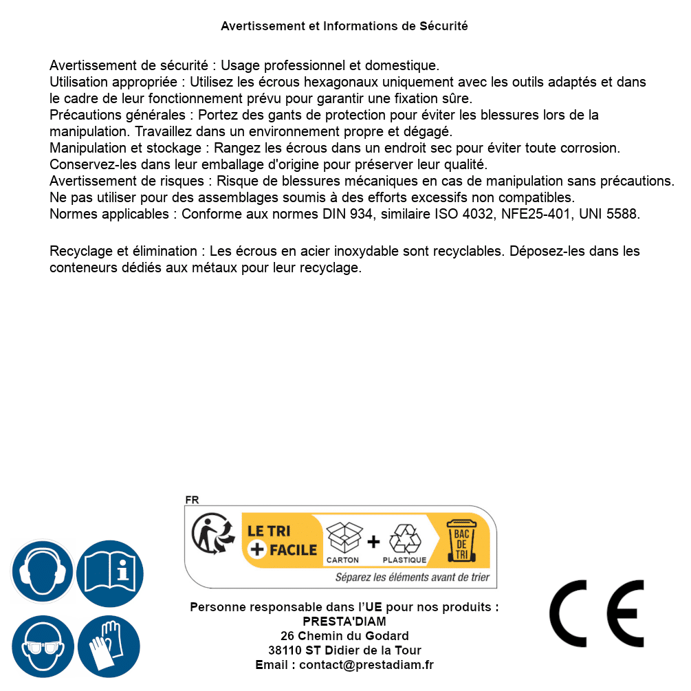 | WARNING and SAFETY | Identification de la personne responsable dans l’UE : Nom : PRESTA'DIAM. Adresse : 26 Chemin du Godard, 38110 ST Didier de la Tour (France). Email : contact@prestadiam.fr. |