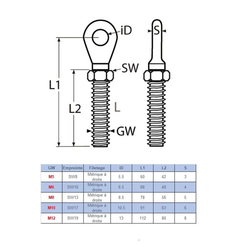 5 Embouts filetés à œil 5 mm - Inox A4 - Pas à droite - ACTON