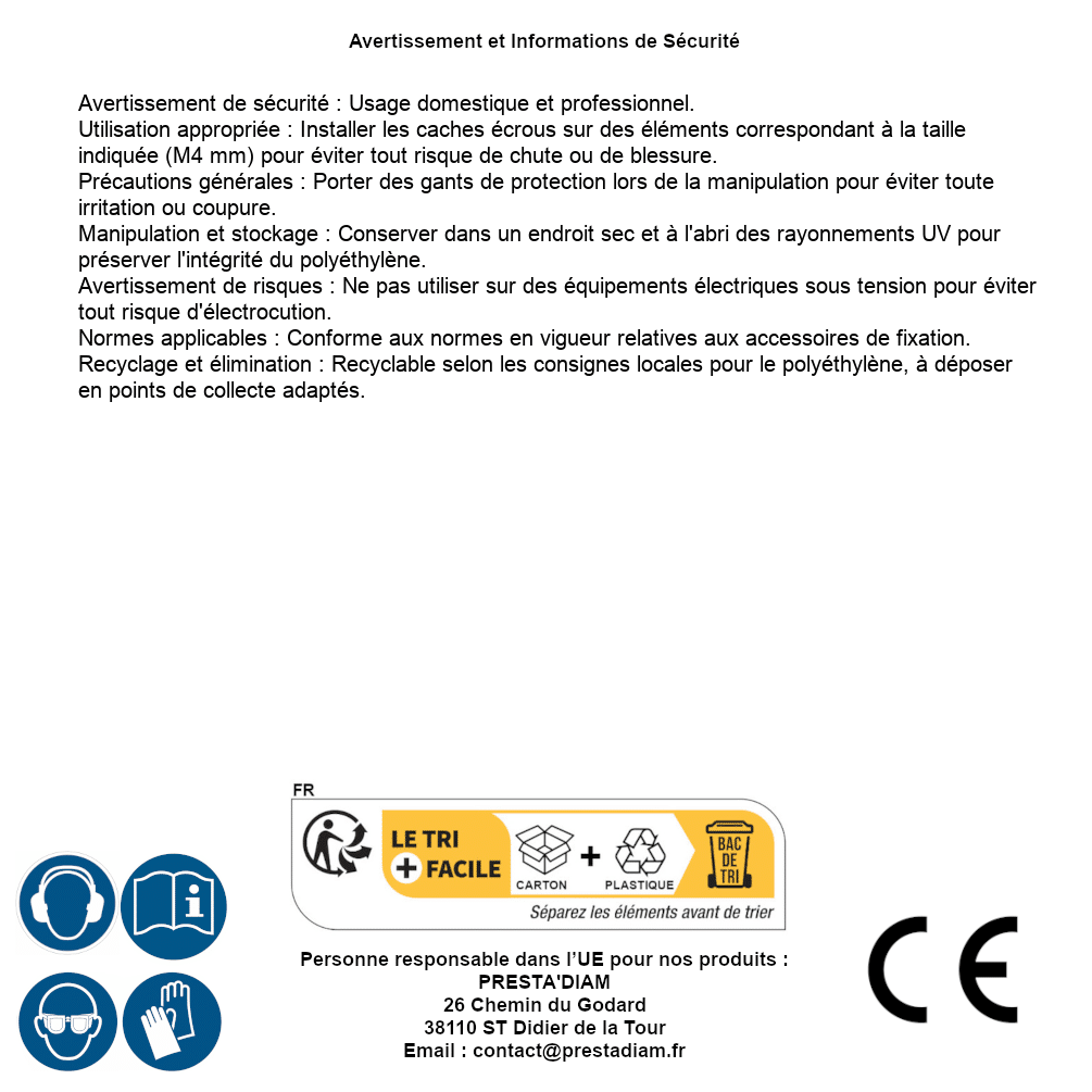 | WARNING and SAFETY | Identification de la personne responsable dans l’UE : Nom : PRESTA'DIAM. Adresse : 26 Chemin du Godard, 38110 ST Didier de la Tour (France). Email : contact@prestadiam.fr. |