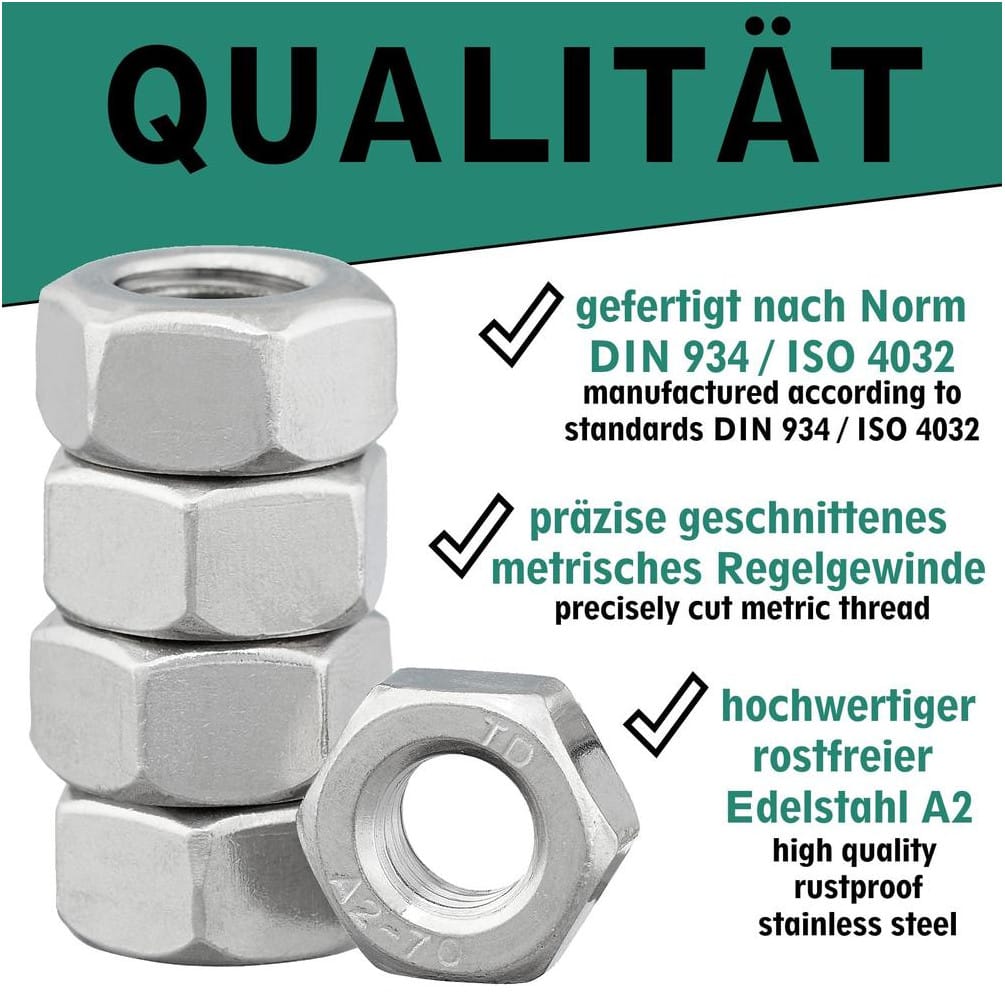 50 Écrous hexagonaux pas à gauche M12 - Inox A2, norme DIN 934 - ACTON