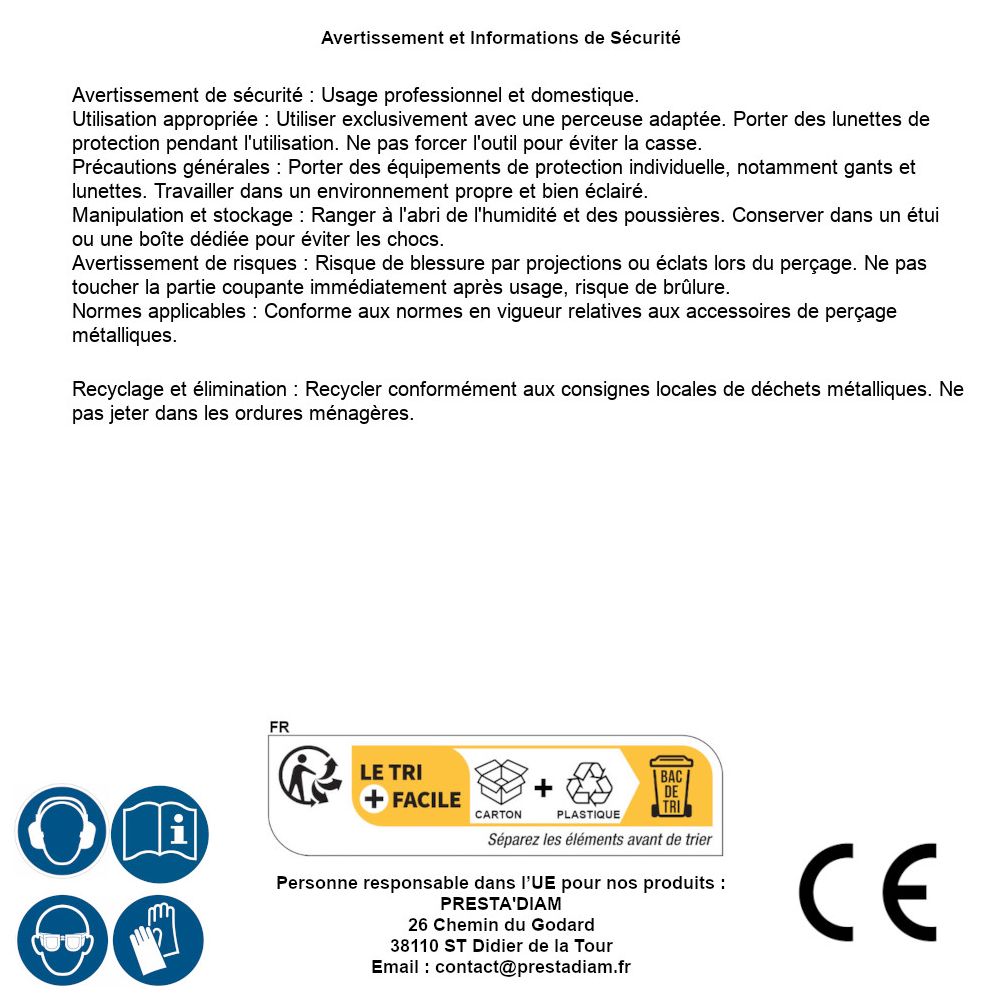 | WARNING and SAFETY | Identification de la personne responsable dans l’UE : Nom : PRESTA'DIAM. Adresse : 26 Chemin du Godard, 38110 ST Didier de la Tour (France). Email : contact@prestadiam.fr. |