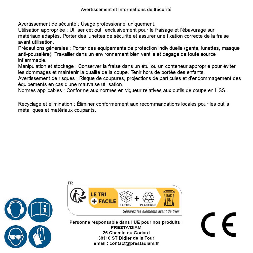 | WARNING and SAFETY | Identification de la personne responsable dans l’UE : Nom : PRESTA'DIAM. Adresse : 26 Chemin du Godard, 38110 ST Didier de la Tour (France). Email : contact@prestadiam.fr. |