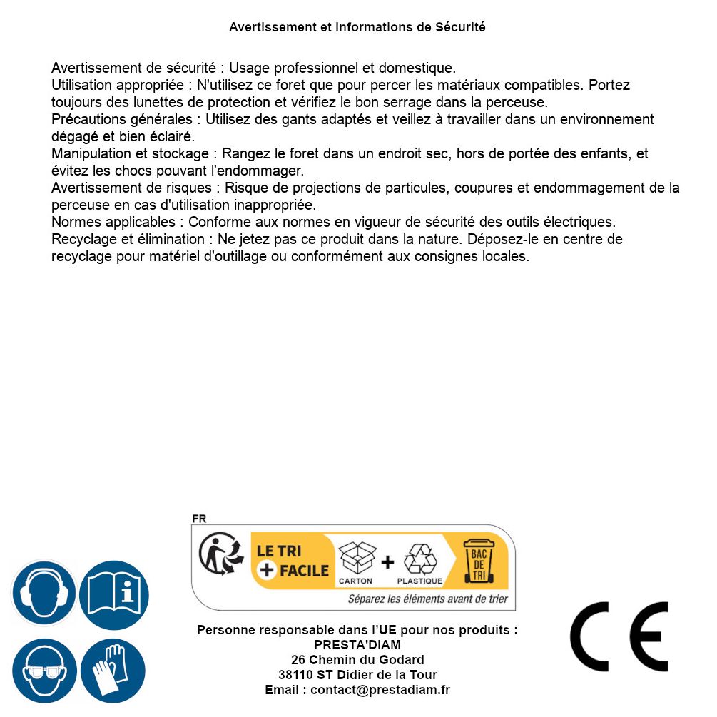 | WARNING and SAFETY | Identification de la personne responsable dans l’UE : Nom : PRESTA'DIAM. Adresse : 26 Chemin du Godard, 38110 ST Didier de la Tour (France). Email : contact@prestadiam.fr. |