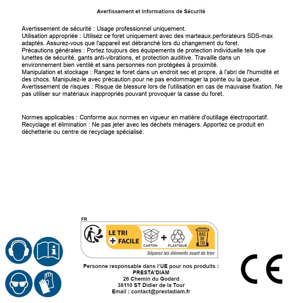 | WARNING and SAFETY | Identification de la personne responsable dans l’UE : Nom : PRESTA'DIAM. Adresse : 26 Chemin du Godard, 38110 ST Didier de la Tour (France). Email : contact@prestadiam.fr. |