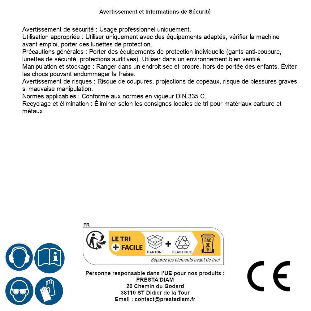 | WARNING and SAFETY | Identification de la personne responsable dans l’UE : Nom : PRESTA'DIAM. Adresse : 26 Chemin du Godard, 38110 ST Didier de la Tour (France). Email : contact@prestadiam.fr. |