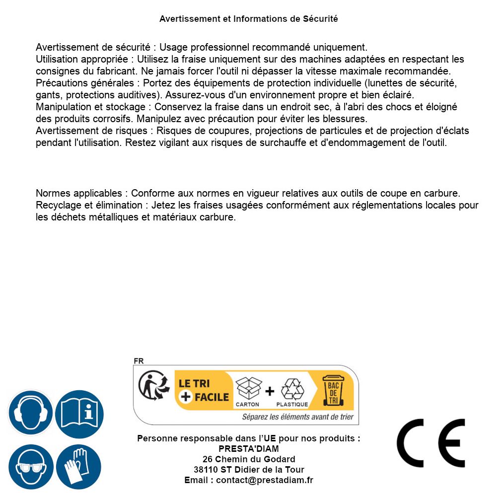 | WARNING and SAFETY | Identification de la personne responsable dans l’UE : Nom : PRESTA'DIAM. Adresse : 26 Chemin du Godard, 38110 ST Didier de la Tour (France). Email : contact@prestadiam.fr. |