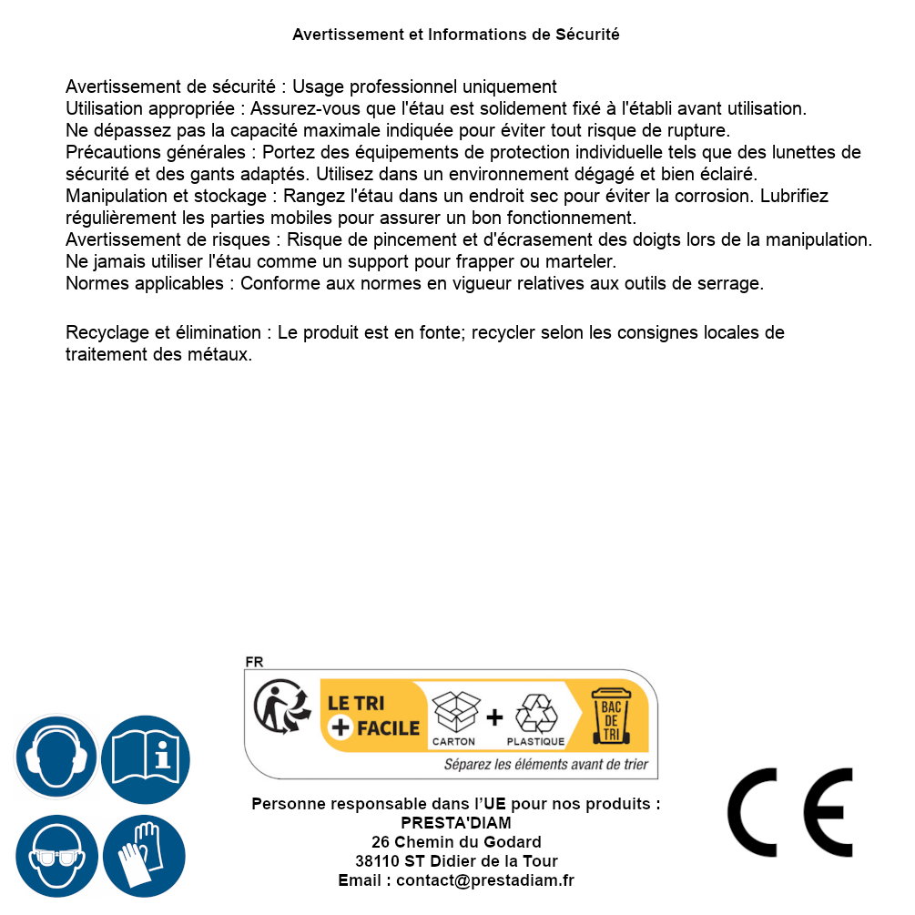 | WARNING and SAFETY | Identification de la personne responsable dans l’UE : Nom : PRESTA'DIAM. Adresse : 26 Chemin du Godard, 38110 ST Didier de la Tour (France). Email : contact@prestadiam.fr. |