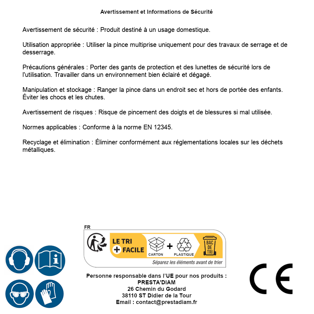 | AVVERTENZA e SICUREZZA | Avertissement de sécurité : Produit destiné à un usage domestique.Utilisation appropriée : Utiliser la pince multiprise uniquement pour des travaux de serrage et de desserrage.Précautions générales : Porter des gants de protection et des lunettes de sécurité lors de l'utilisation. Travailler dans un environnement bien éclairé et dégagé.Manipulation et stockage : Ranger la pince dans un endroit sec et hors de portée des enfants. Éviter les chocs et les chutes.Avertissement de risques : Risque de pincement des doigts et de blessures si mal utilisée.Normes applicables : Conforme à la norme EN 12345.Recyclage et élimination : Éliminer conformément aux réglementations locales sur les déchets métalliques. Identification de la personne responsable dans l’UE : Nom : PRESTA'DIAM. Adresse : 26 Chemin du Godard, 38110 ST Didier de la Tour (France). Email : contact@prestadiam.fr. |