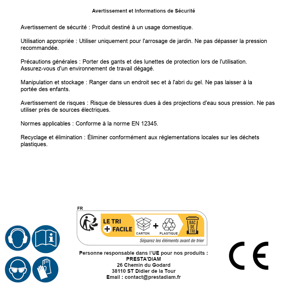 | AVVERTENZA e SICUREZZA | Avertissement de sécurité : Produit destiné à un usage domestique.Utilisation appropriée : Utiliser uniquement pour l'arrosage de jardin. Ne pas dépasser la pression recommandée.Précautions générales : Porter des gants et des lunettes de protection lors de l'utilisation. Assurez-vous d'un environnement de travail dégagé.Manipulation et stockage : Ranger dans un endroit sec et à l'abri du gel. Ne pas laisser à la portée des enfants.Avertissement de risques : Risque de blessures dues à des projections d'eau sous pression. Ne pas utiliser près de sources électriques.Normes applicables : Conforme à la norme EN 12345.Recyclage et élimination : Éliminer conformément aux réglementations locales sur les déchets plastiques. Identification de la personne responsable dans l’UE : Nom : PRESTA'DIAM. Adresse : 26 Chemin du Godard, 38110 ST Didier de la Tour (France). Email : contact@prestadiam.fr. |