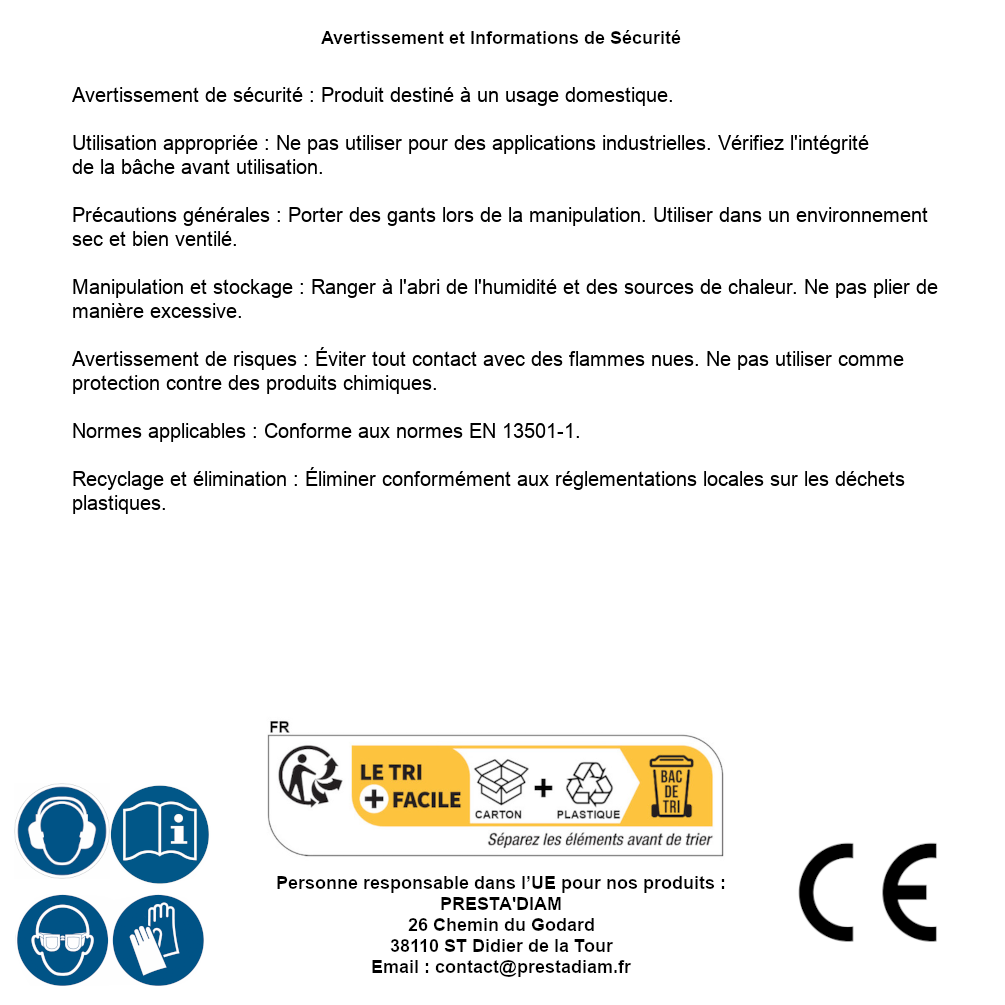 | AVVERTENZA e SICUREZZA | Avertissement de sécurité : Produit destiné à un usage domestique.Utilisation appropriée : Ne pas utiliser pour des applications industrielles. Vérifiez l'intégrité de la bâche avant utilisation.Précautions générales : Porter des gants lors de la manipulation. Utiliser dans un environnement sec et bien ventilé.Manipulation et stockage : Ranger à l'abri de l'humidité et des sources de chaleur. Ne pas plier de manière excessive.Avertissement de risques : Éviter tout contact avec des flammes nues. Ne pas utiliser comme protection contre des produits chimiques.Normes applicables : Conforme aux normes EN 13501-1.Recyclage et élimination : Éliminer conformément aux réglementations locales sur les déchets plastiques. Identification de la personne responsable dans l’UE : Nom : PRESTA'DIAM. Adresse : 26 Chemin du Godard, 38110 ST Didier de la Tour (France). Email : contact@prestadiam.fr. |