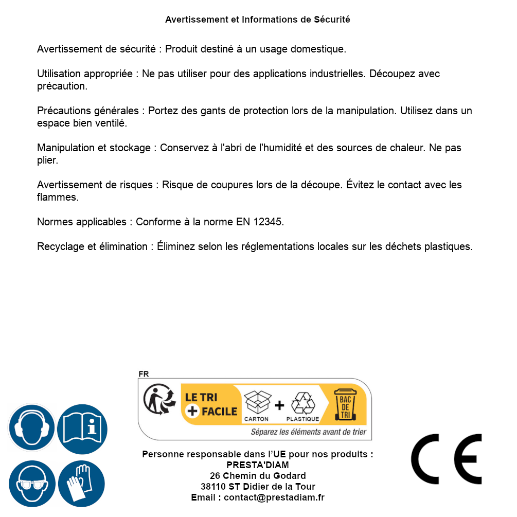 | AVVERTENZA e SICUREZZA | Avertissement de sécurité : Produit destiné à un usage domestique.Utilisation appropriée : Ne pas utiliser pour des applications industrielles. Découpez avec précaution.Précautions générales : Portez des gants de protection lors de la manipulation. Utilisez dans un espace bien ventilé.Manipulation et stockage : Conservez à l'abri de l'humidité et des sources de chaleur. Ne pas plier.Avertissement de risques : Risque de coupures lors de la découpe. Évitez le contact avec les flammes.Normes applicables : Conforme à la norme EN 12345.Recyclage et élimination : Éliminez selon les réglementations locales sur les déchets plastiques. Identification de la personne responsable dans l’UE : Nom : PRESTA'DIAM. Adresse : 26 Chemin du Godard, 38110 ST Didier de la Tour (France). Email : contact@prestadiam.fr. |