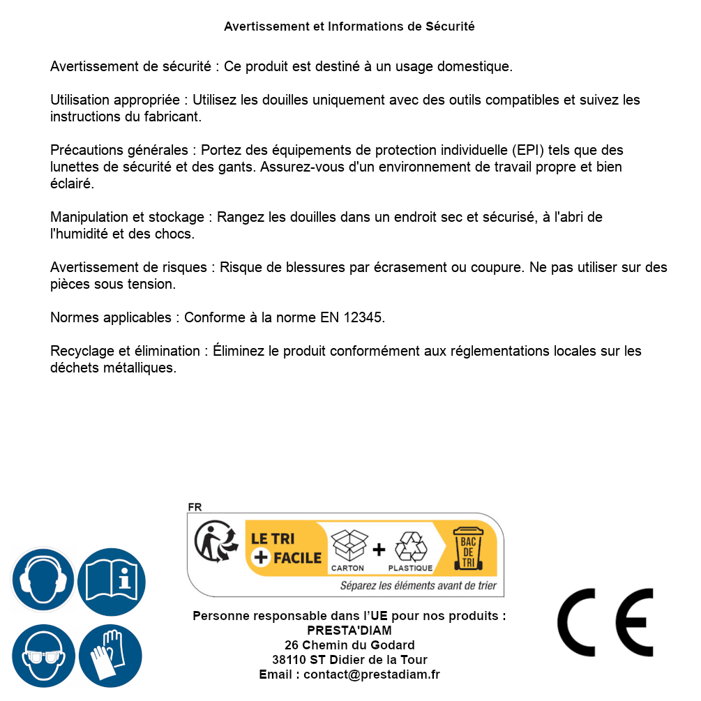 | AVVERTENZA e SICUREZZA | Avertissement de sécurité : Ce produit est destiné à un usage domestique.Utilisation appropriée : Utilisez les douilles uniquement avec des outils compatibles et suivez les instructions du fabricant.Précautions générales : Portez des équipements de protection individuelle (EPI) tels que des lunettes de sécurité et des gants. Assurez-vous d'un environnement de travail propre et bien éclairé.Manipulation et stockage : Rangez les douilles dans un endroit sec et sécurisé, à l'abri de l'humidité et des chocs.Avertissement de risques : Risque de blessures par écrasement ou coupure. Ne pas utiliser sur des pièces sous tension.Normes applicables : Conforme à la norme EN 12345.Recyclage et élimination : Éliminez le produit conformément aux réglementations locales sur les déchets métalliques. Identification de la personne responsable dans l’UE : Nom : PRESTA'DIAM. Adresse : 26 Chemin du Godard, 38110 ST Didier de la Tour (France). Email : contact@prestadiam.fr. |