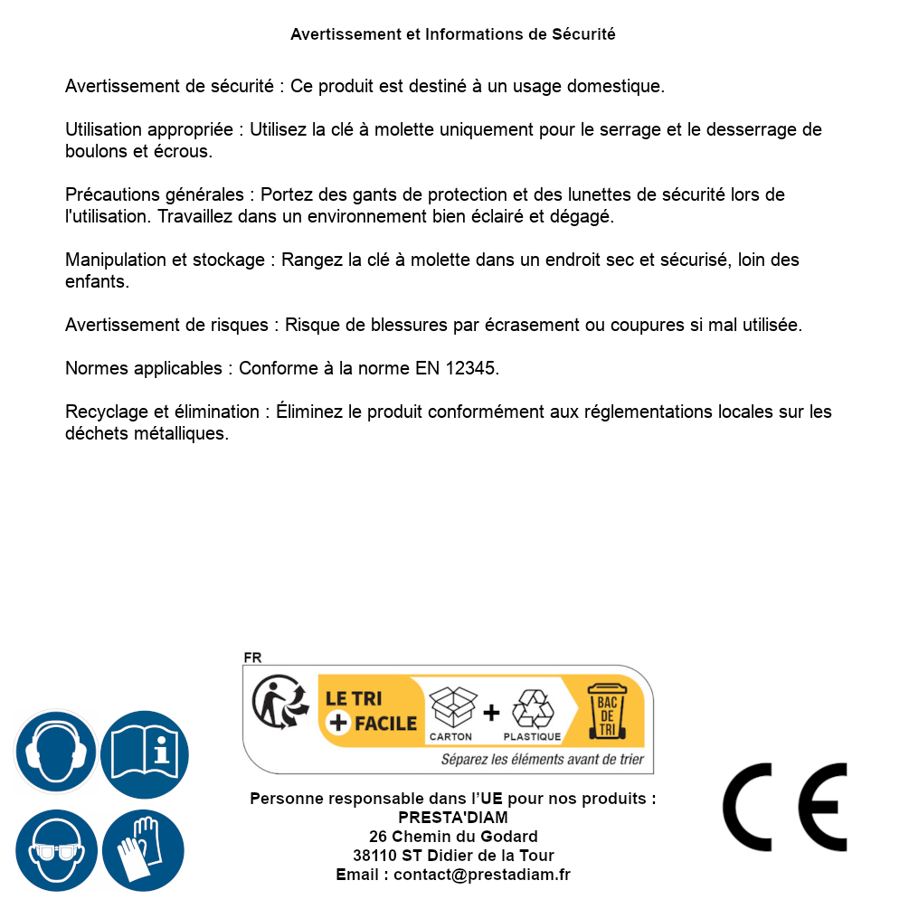 | AVVERTENZA e SICUREZZA | Avertissement de sécurité : Ce produit est destiné à un usage domestique.Utilisation appropriée : Utilisez la clé à molette uniquement pour le serrage et le desserrage de boulons et écrous.Précautions générales : Portez des gants de protection et des lunettes de sécurité lors de l'utilisation. Travaillez dans un environnement bien éclairé et dégagé.Manipulation et stockage : Rangez la clé à molette dans un endroit sec et sécurisé, loin des enfants.Avertissement de risques : Risque de blessures par écrasement ou coupures si mal utilisée.Normes applicables : Conforme à la norme EN 12345.Recyclage et élimination : Éliminez le produit conformément aux réglementations locales sur les déchets métalliques. Identification de la personne responsable dans l’UE : Nom : PRESTA'DIAM. Adresse : 26 Chemin du Godard, 38110 ST Didier de la Tour (France). Email : contact@prestadiam.fr. |