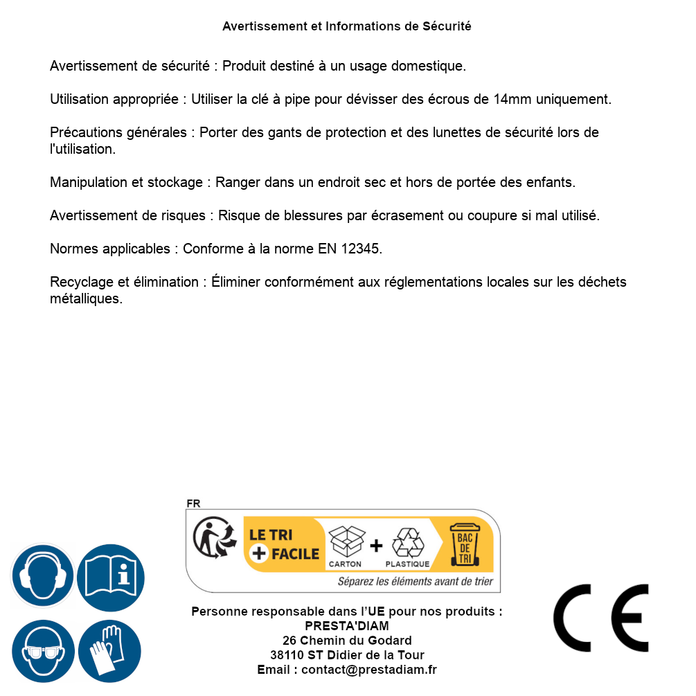 | AVVERTENZA e SICUREZZA | Avertissement de sécurité : Produit destiné à un usage domestique.Utilisation appropriée : Utiliser la clé à pipe pour dévisser des écrous de 14mm uniquement.Précautions générales : Porter des gants de protection et des lunettes de sécurité lors de l'utilisation.Manipulation et stockage : Ranger dans un endroit sec et hors de portée des enfants.Avertissement de risques : Risque de blessures par écrasement ou coupure si mal utilisé.Normes applicables : Conforme à la norme EN 12345.Recyclage et élimination : Éliminer conformément aux réglementations locales sur les déchets métalliques. Identification de la personne responsable dans l’UE : Nom : PRESTA'DIAM. Adresse : 26 Chemin du Godard, 38110 ST Didier de la Tour (France). Email : contact@prestadiam.fr. |