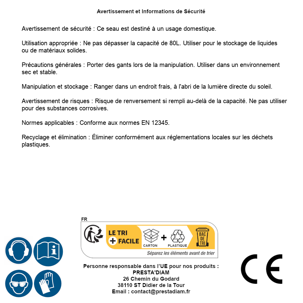 | AVVERTENZA e SICUREZZA | Avertissement de sécurité : Ce seau est destiné à un usage domestique.Utilisation appropriée : Ne pas dépasser la capacité de 80L. Utiliser pour le stockage de liquides ou de matériaux solides.Précautions générales : Porter des gants lors de la manipulation. Utiliser dans un environnement sec et stable.Manipulation et stockage : Ranger dans un endroit frais, à l'abri de la lumière directe du soleil.Avertissement de risques : Risque de renversement si rempli au-delà de la capacité. Ne pas utiliser pour des substances corrosives.Normes applicables : Conforme aux normes EN 12345.Recyclage et élimination : Éliminer conformément aux réglementations locales sur les déchets plastiques. Identification de la personne responsable dans l’UE : Nom : PRESTA'DIAM. Adresse : 26 Chemin du Godard, 38110 ST Didier de la Tour (France). Email : contact@prestadiam.fr. |