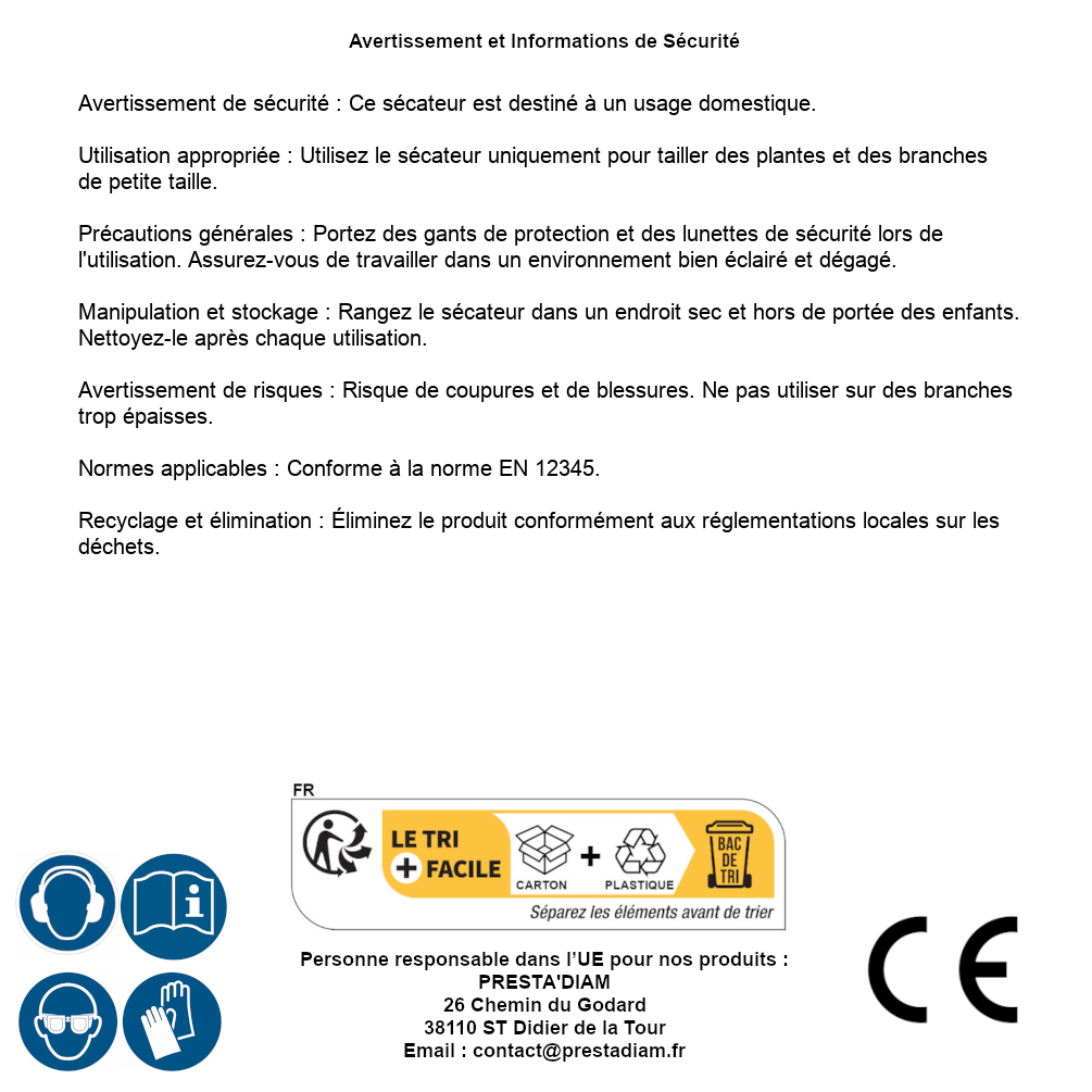 | AVVERTENZA e SICUREZZA | Avertissement de sécurité : Ce sécateur est destiné à un usage domestique.Utilisation appropriée : Utilisez le sécateur uniquement pour tailler des plantes et des branches de petite taille.Précautions générales : Portez des gants de protection et des lunettes de sécurité lors de l'utilisation. Assurez-vous de travailler dans un environnement bien éclairé et dégagé.Manipulation et stockage : Rangez le sécateur dans un endroit sec et hors de portée des enfants. Nettoyez-le après chaque utilisation.Avertissement de risques : Risque de coupures et de blessures. Ne pas utiliser sur des branches trop épaisses.Normes applicables : Conforme à la norme EN 12345.Recyclage et élimination : Éliminez le produit conformément aux réglementations locales sur les déchets. Identification de la personne responsable dans l’UE : Nom : PRESTA'DIAM. Adresse : 26 Chemin du Godard, 38110 ST Didier de la Tour (France). Email : contact@prestadiam.fr. |