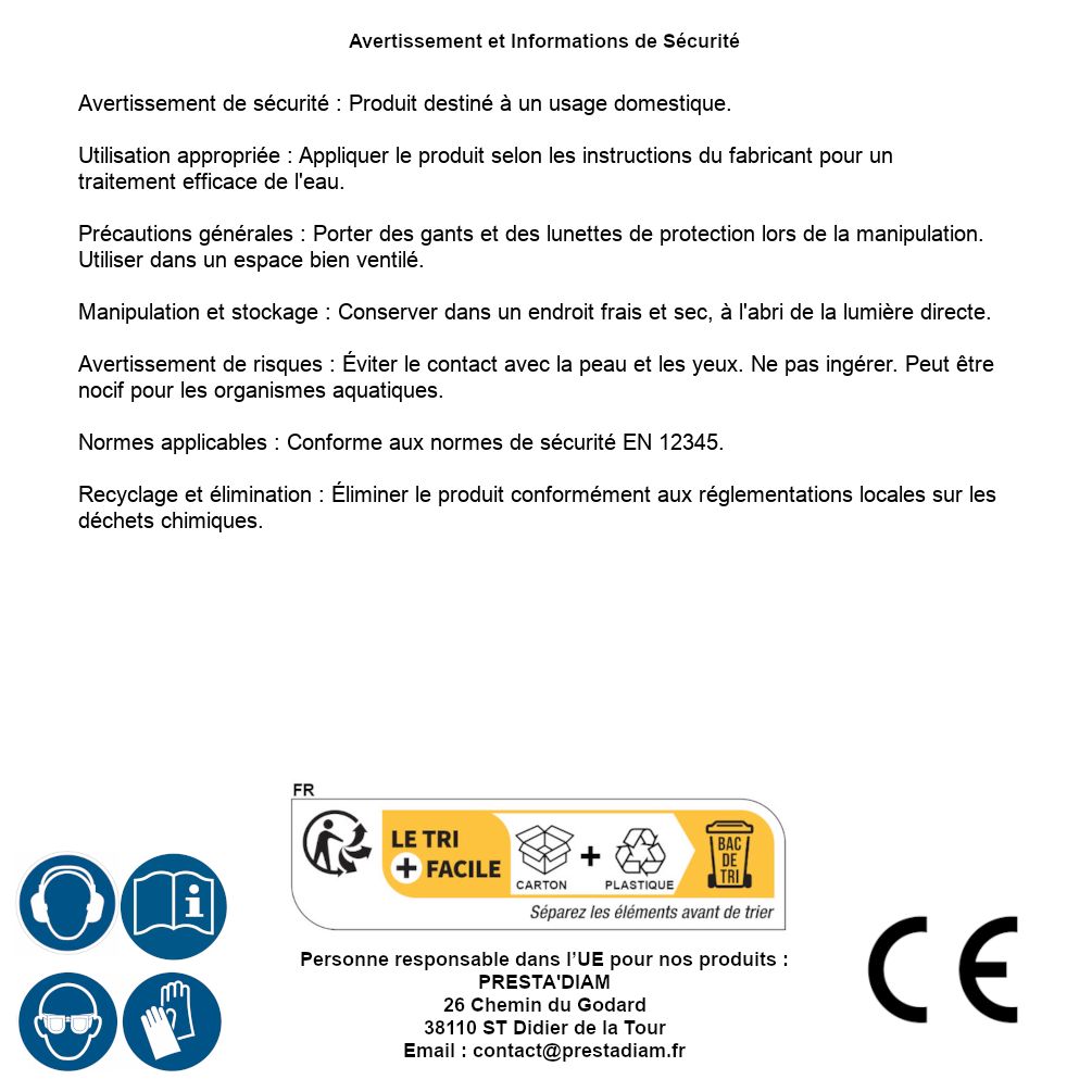 | AVVERTENZA e SICUREZZA | Avertissement de sécurité : Produit destiné à un usage domestique.Utilisation appropriée : Appliquer le produit selon les instructions du fabricant pour un traitement efficace de l'eau.Précautions générales : Porter des gants et des lunettes de protection lors de la manipulation. Utiliser dans un espace bien ventilé.Manipulation et stockage : Conserver dans un endroit frais et sec, à l'abri de la lumière directe.Avertissement de risques : Éviter le contact avec la peau et les yeux. Ne pas ingérer. Peut être nocif pour les organismes aquatiques.Normes applicables : Conforme aux normes de sécurité EN 12345.Recyclage et élimination : Éliminer le produit conformément aux réglementations locales sur les déchets chimiques. Identification de la personne responsable dans l’UE : Nom : PRESTA'DIAM. Adresse : 26 Chemin du Godard, 38110 ST Didier de la Tour (France). Email : contact@prestadiam.fr. |