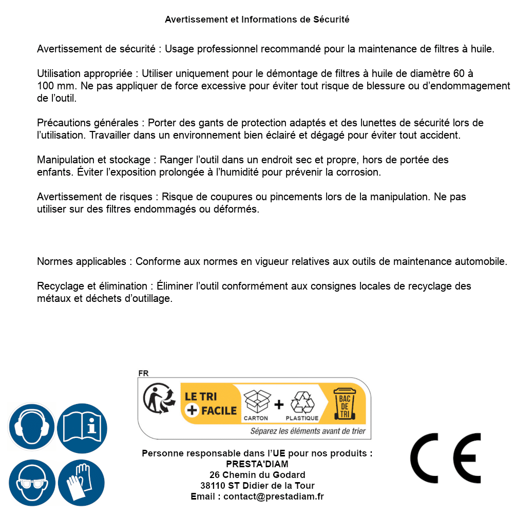| Persona responsabile UE | PRESTA'DIAM 26 Chemin du Godard 38110 ST Didier de la Tour Email : contact@prestadiam.fr |