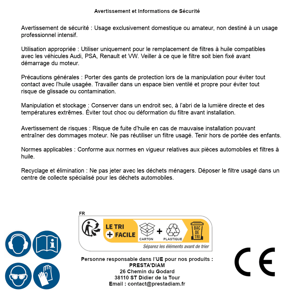 | Persona responsabile UE | PRESTA'DIAM 26 Chemin du Godard 38110 ST Didier de la Tour Email : contact@prestadiam.fr |