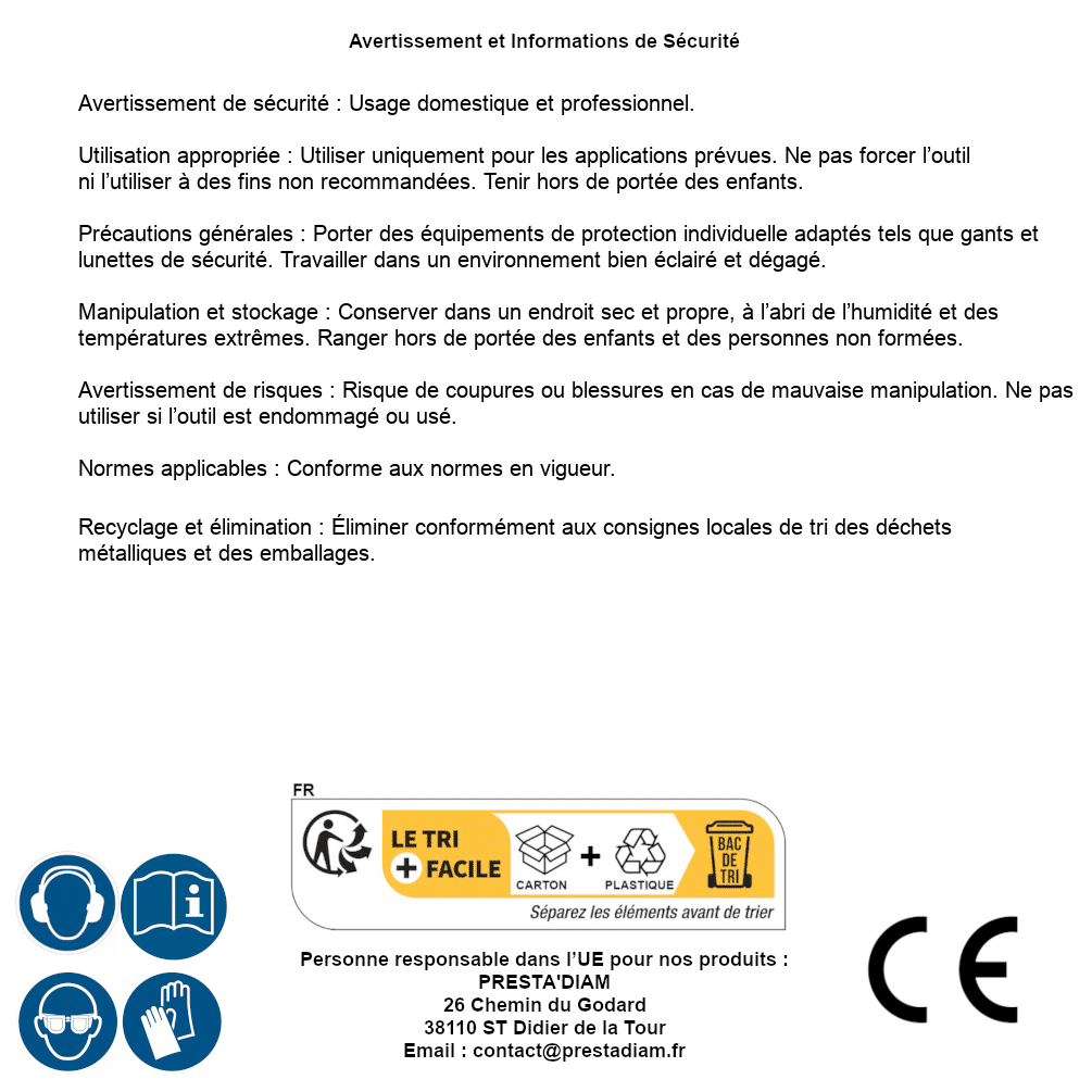 | Persona responsabile UE | PRESTA'DIAM 26 Chemin du Godard 38110 ST Didier de la Tour Email : contact@prestadiam.fr |