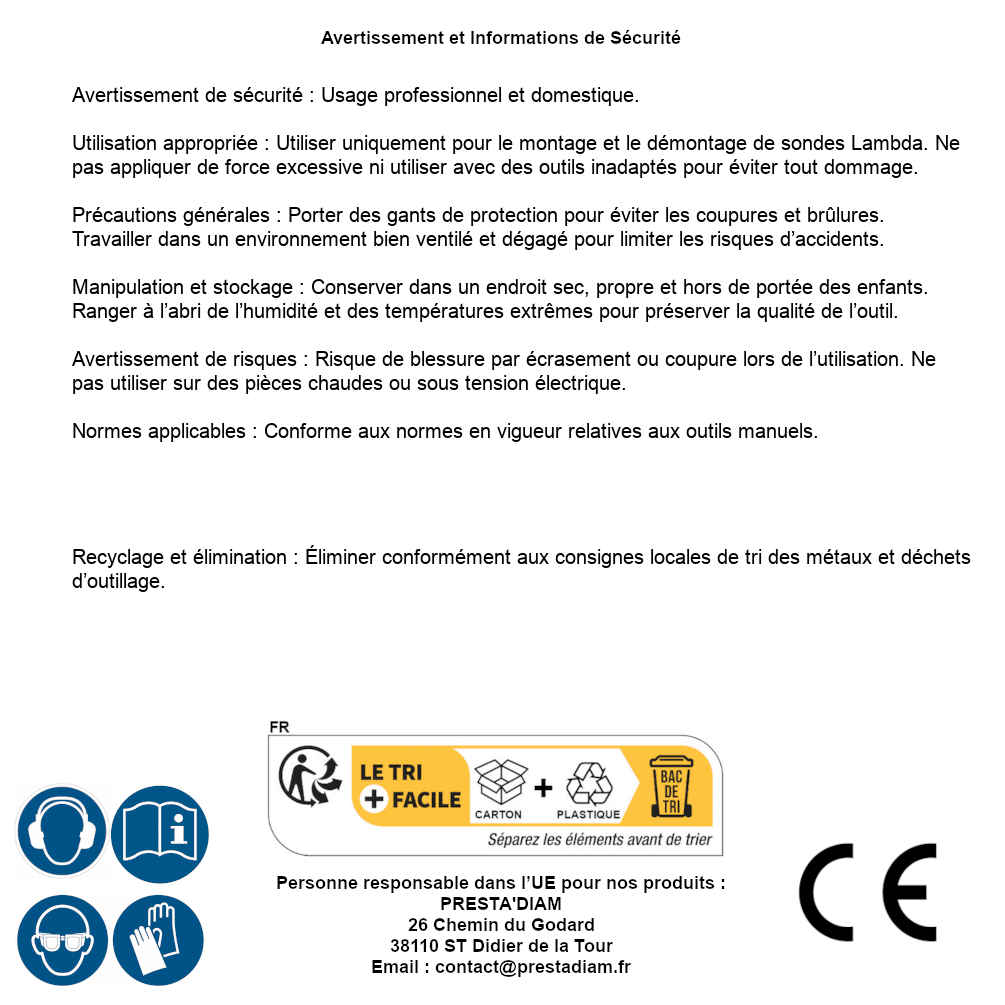 | Persona responsabile UE | PRESTA'DIAM 26 Chemin du Godard 38110 ST Didier de la Tour Email : contact@prestadiam.fr |